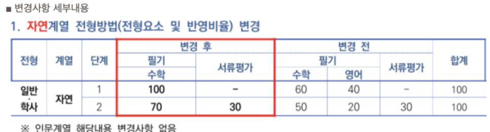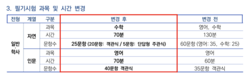 | 인문 | 필기시험 | 영어 35문항 / 60분 | 영어 40문항 / 70분 | 시험 시간 및 문항 수 확대 |