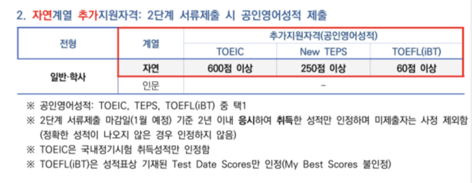 | 자연 | 지원자격 | 별도 조건 없음 | 2단계 서류 제출 시 공인영어성적 제출 | 공인영어성적(P/F) 의무화 |