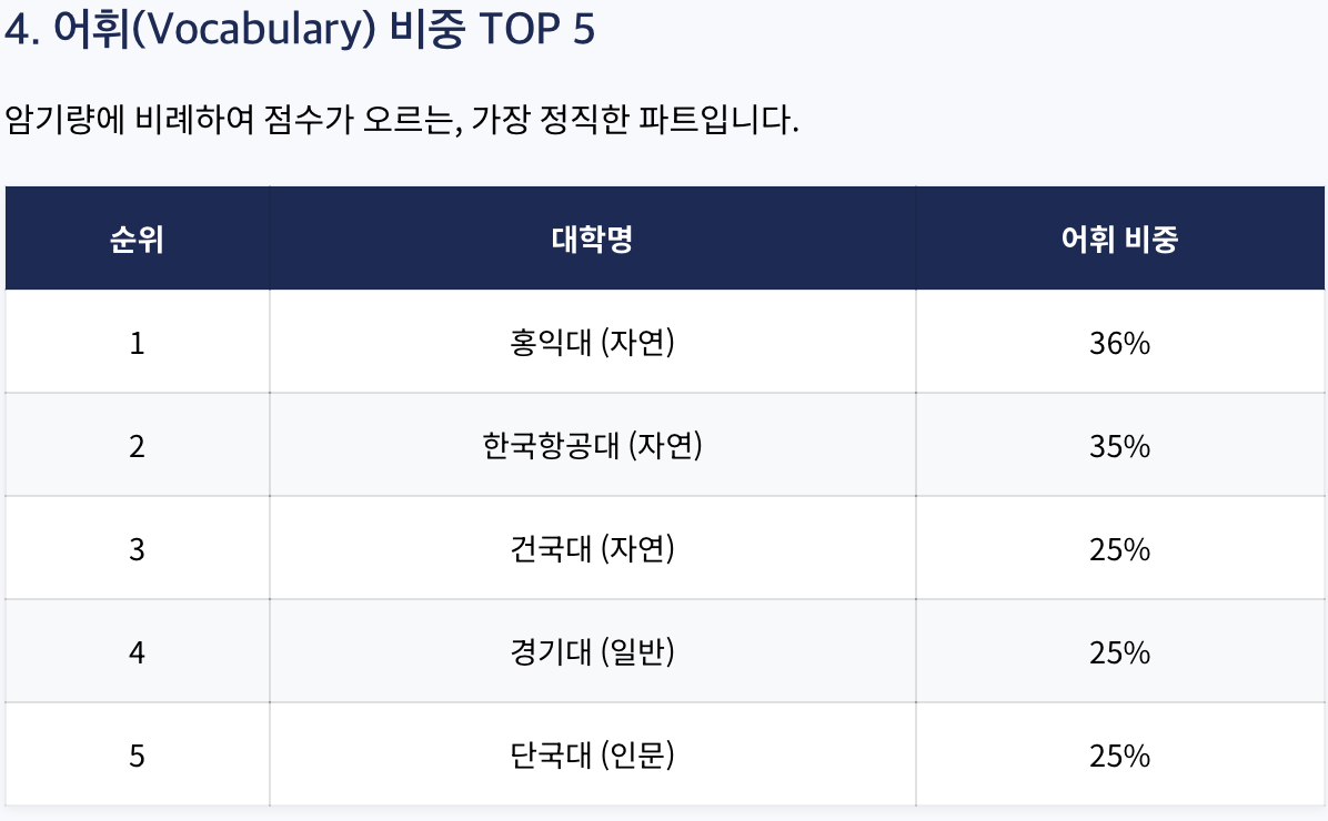 → 문법, 어휘 등 암기 파트 비중이 높은 대학(세종대, 단국대 등)을 목표로 설정하여 집중 공략.