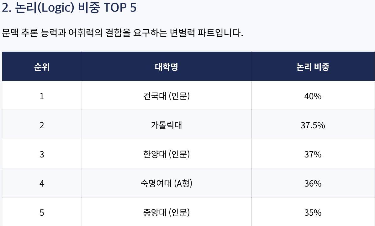논리완성(Logic Completion) 영역 고비중 대학 TOP 5 분석: 논리 파트는 어휘력과 독해력의 중간다리 역할을 한다. 건국대, 한양대 등은 논리 문제의 난이도와 비중을 높여 변별력을 확보하는 경향이 뚜렷하다.
