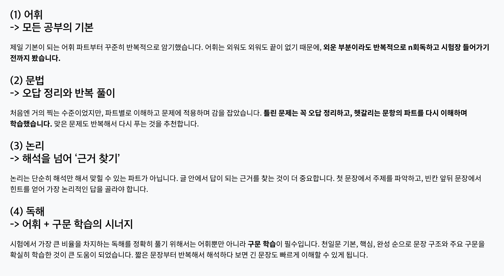 - 사례 A (인문): '천일문'과 같은 기초 구문 교재 학습을 통해, 단순히 문법 규칙을 암기하는 것을 넘어 문장의 논리적 구조와 흐름을 파악하는 능력을 배양했다. 이는 건국대 편입영어의 고난도 독해 지문 해결에 직접적인 영향을 미쳤다.