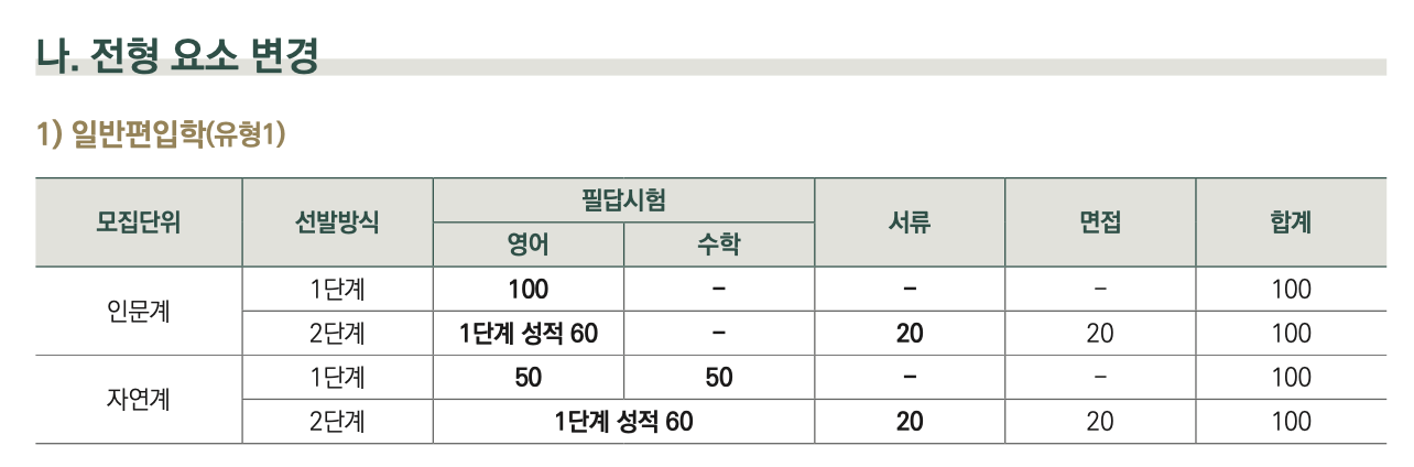 | 구분 | 단계 | 필기(영/수) | GPA(성적) | 서류 | 면접 | 합계 |